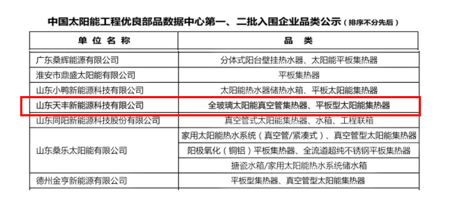 2018年10月,全國首個“中國太陽能工程優良部品數據中心”成立,山東天豐新能源科技有限公司太陽能系列產品成功首批入圍!