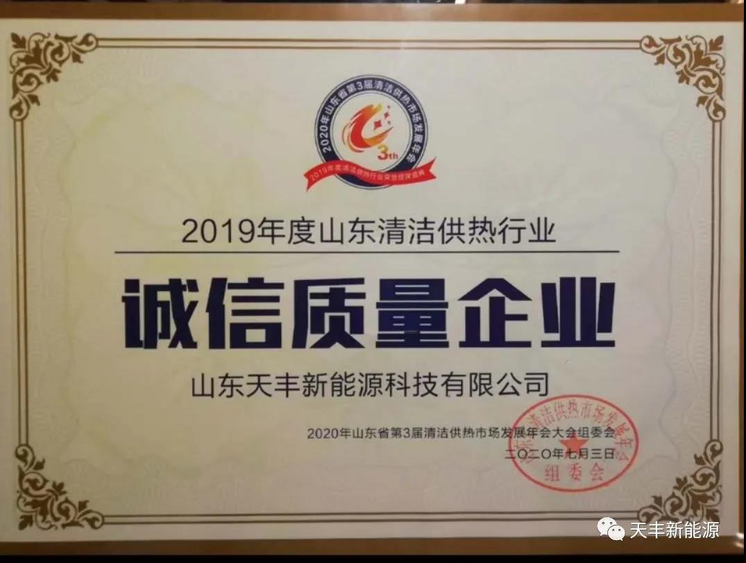 實力入選,載譽歸來!天豐新能源榮獲2019年度清潔供熱行業“誠信質量企業”榮譽授牌